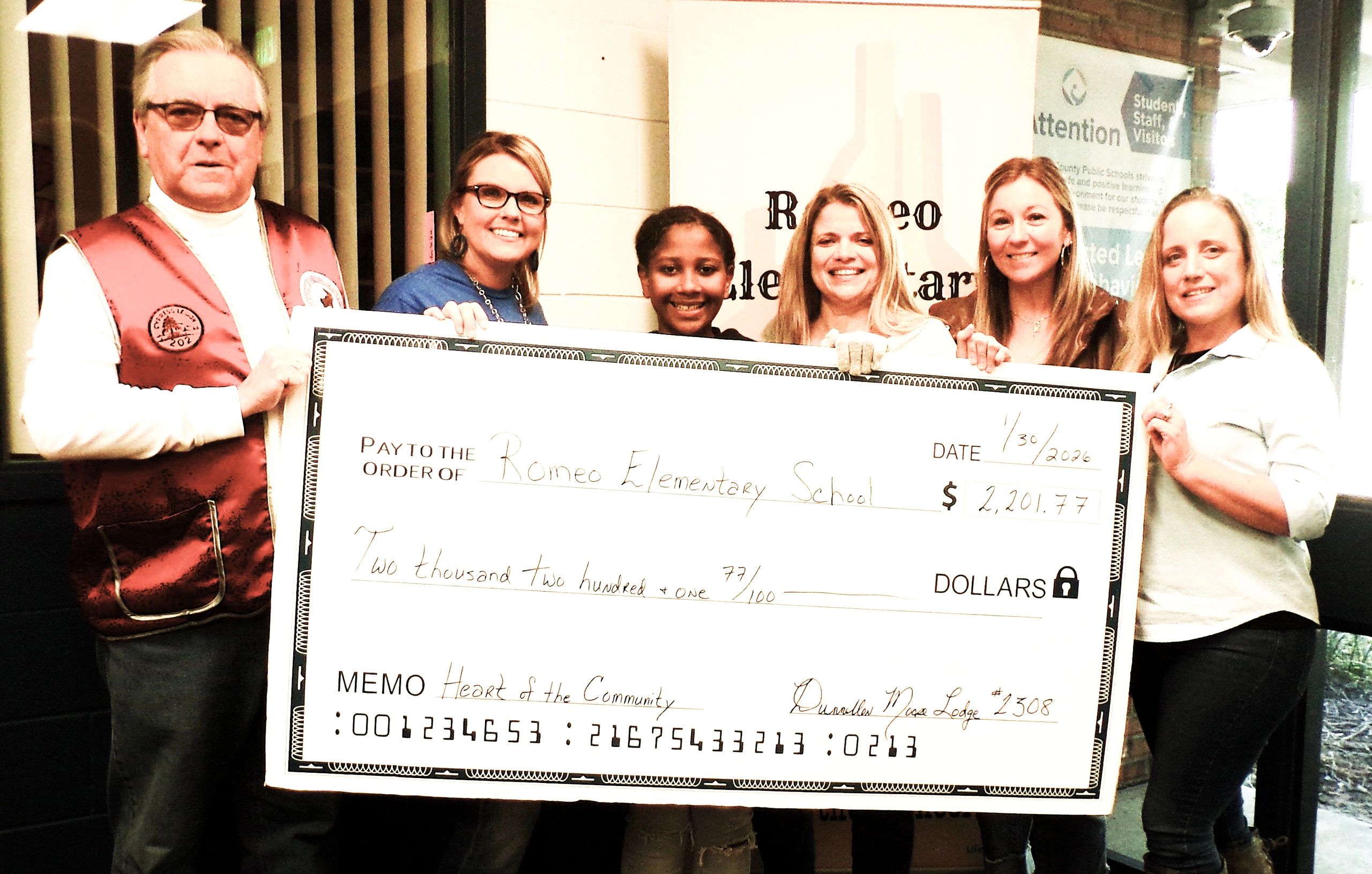 Dunnellon Moose Lodge 2308 showed its true Heart of the Community by donating $2,201.77 to Romeo Elementary School after last month's community service event.